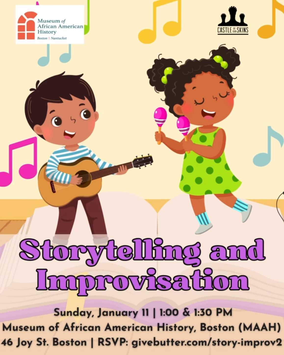This Sunday we’re BACK at the Museum of African American History with Storytelling & Improvisation—an interactive, fun-filled workshop where storybooks leap off the page through music. Designed for children ages 4–10, this playful experience invites young participants to become musical storytellers, using their voices and beginner-friendly instruments to explore character, plot, and emotion in real time.