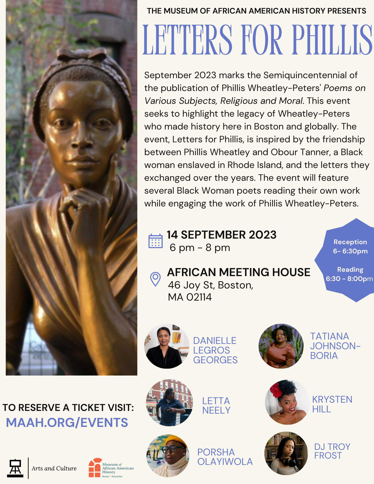 September 2023 marks the Semiquincentennial of the publication of Phillis Wheatley-Peters' Poems on Various Subjects, Religious and Moral. This event seeks to highlight the legacy of Wheatley-Peters who made history here in Boston and globally. The event, Letters for Phillis, is inspired by the friendship between Phillis Wheatley and Obour Tanner, a Black woman enslaved in Rhode Island, and the letters they exchanged over the years. The event will feature several Black Woman poets reading their own work while engaging the work of Phillis Wheatley-Peters