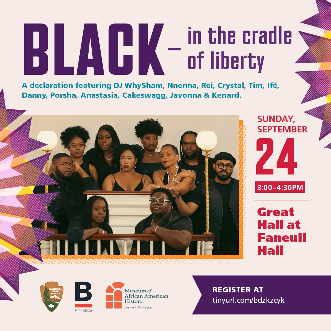 The National Parks of Boston, Mayor's Office of Arts & Culture, and Museum of African American History invite you to the Great Hall in Faneuil Hall on Sunday, September 24 from 3:00-4:30 p.m. for "BLACK in the cradle of liberty," a performance gathering that explores agency, resistance and the power of place. Curated by Boston Poet Laureate Porsha Olayiwola and narrated by Rei Fielder, the afternoon features music, dance and spoken word with an incredible lineup of Boston artists and creatives, including DJ WhySham, Nnenna Loveth, Crystal Valentine, Cakeswagg, Tim Hall, Ifé Franklin and Danny Rivera. A centerpiece of the event is Porsha Olayiwola's debut of “Still Speaking,” a newly commissioned poem performed with dancers Anastasia Wade, Javonna Corbin and Kenard Williams. The event is free and open to the public.
