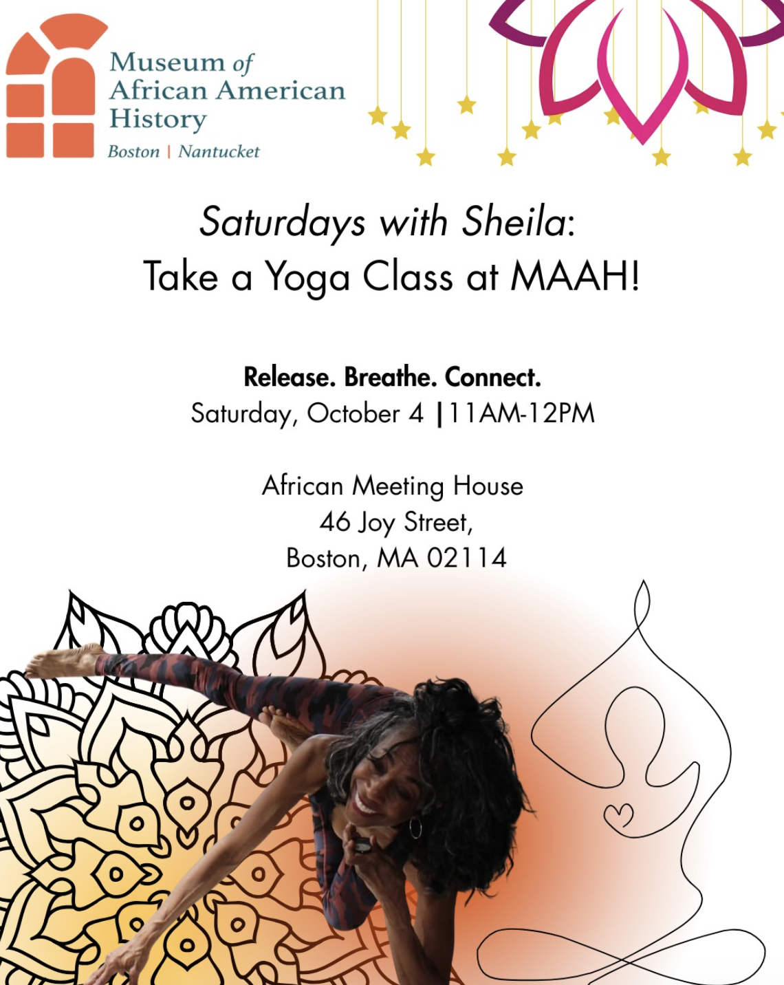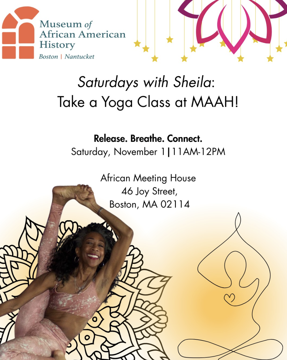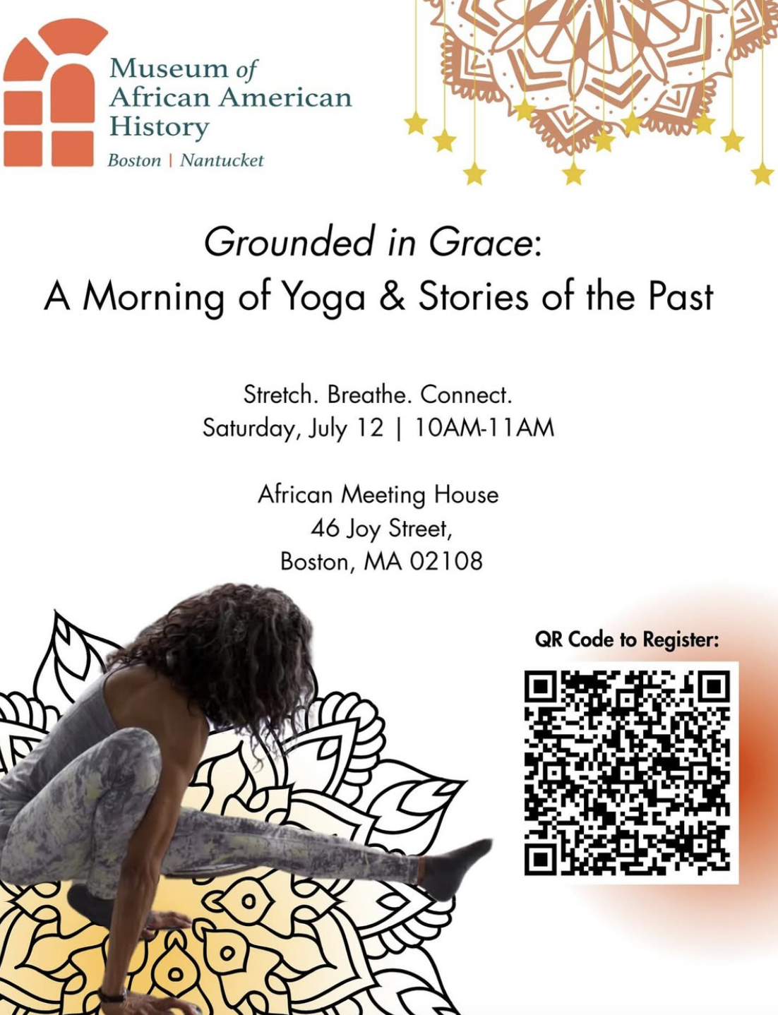 Unite in breath and movement with MAAH and Sheila Thorne of Bous Yoga on July 12th for a morning of relaxation and renewal at the Susan Paul Room in the African Meeting House followed by a tour of the museum.
