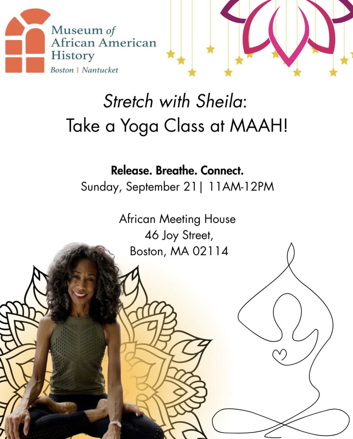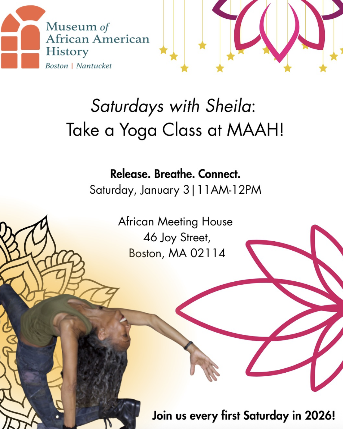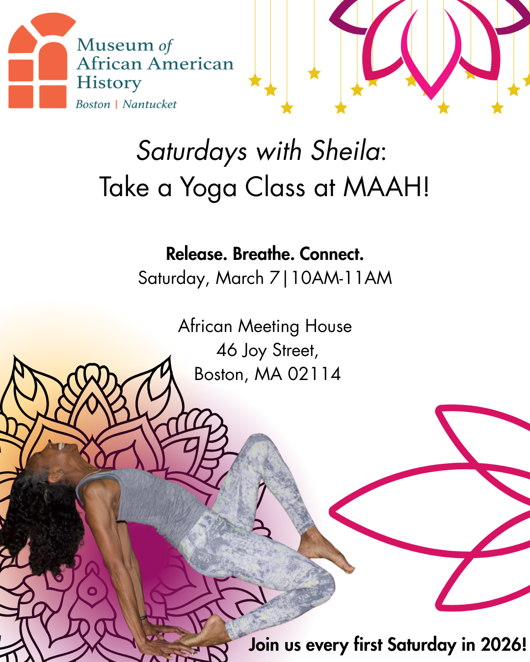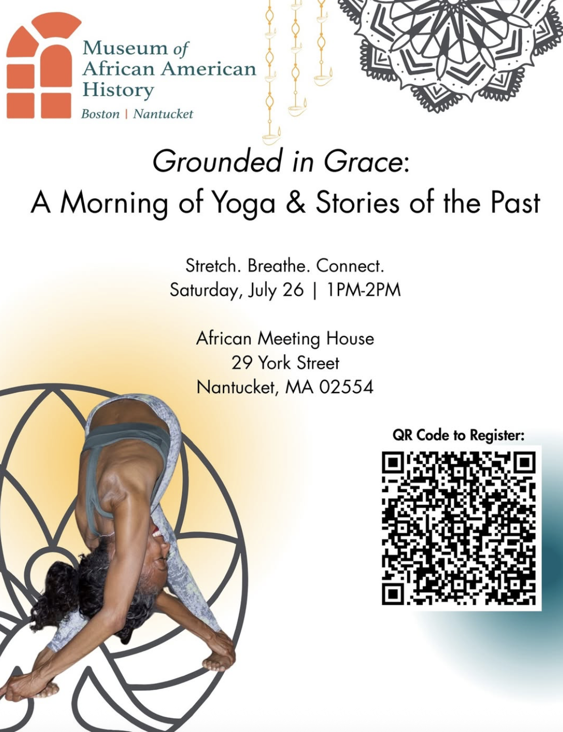 Unite in breath and movement with MAAH and Sheila Thorne of Bous Yoga on July 12th for a morning of relaxation and renewal at the Susan Paul Room in the African Meeting House followed by a tour of the museum.
