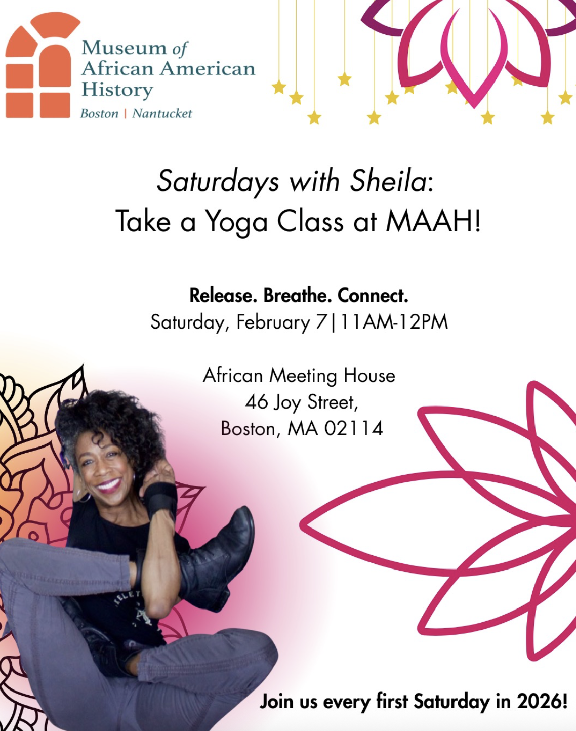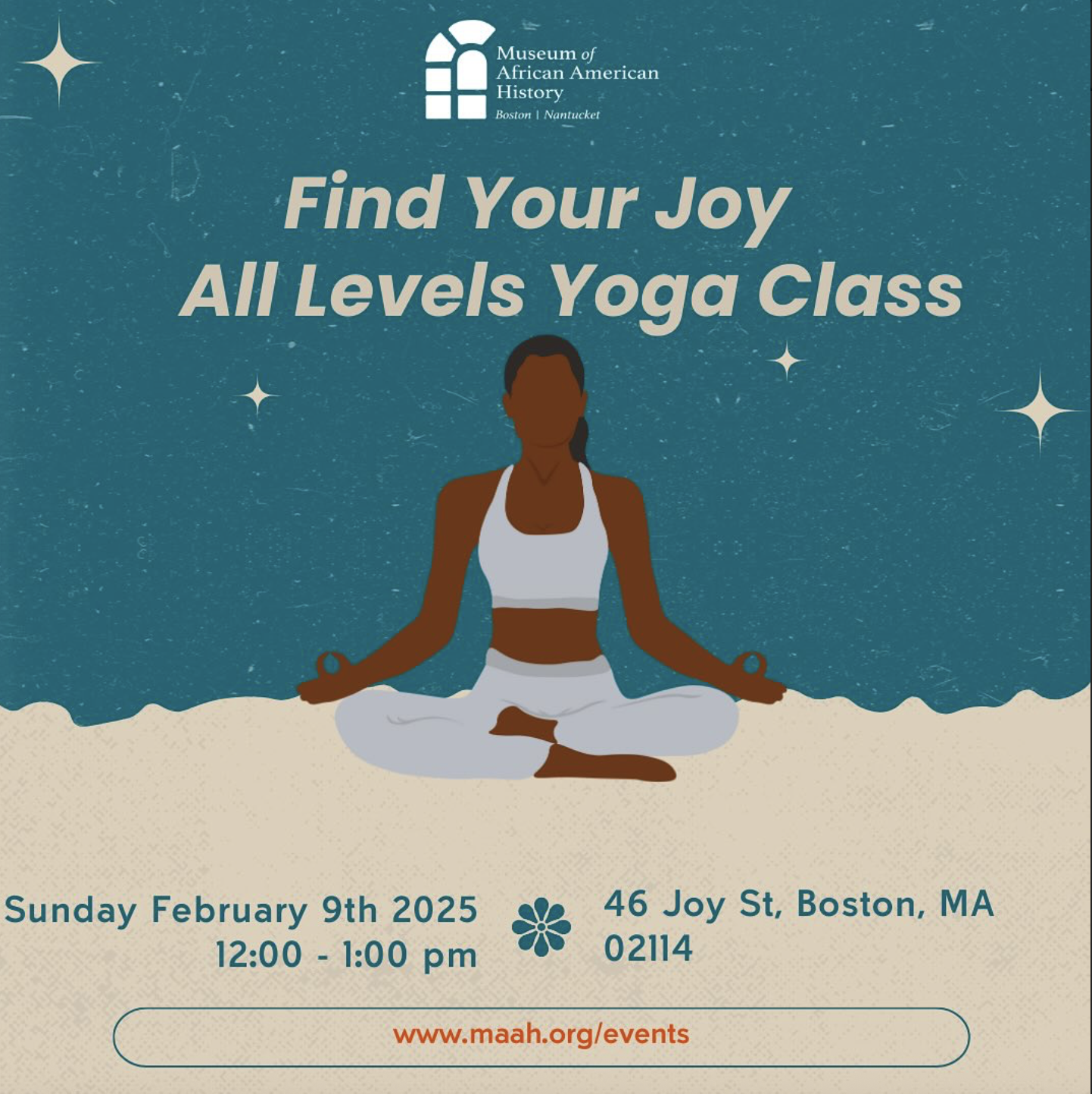 Join the Museum of African American History on February 9th for an All Levels Yoga Class. Whether you are just starting or more advanced, join us for a relaxing class taught by Shelia Thorne.