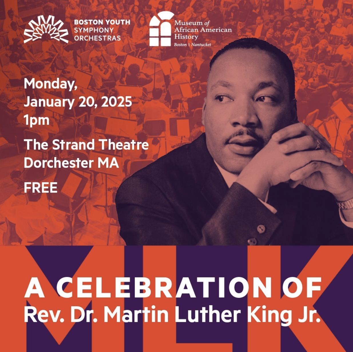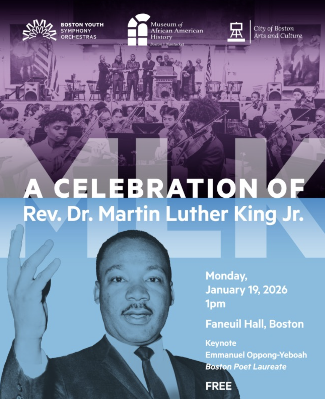 Join us for a moving program featuring classical works, spirituals, and freedom songs performed by young musicians from the Boston Youth Symphony Orchestras’ Intensive Community Program, alongside remarks, readings, and spoken-word tributes to Dr. King’s enduring legacy.