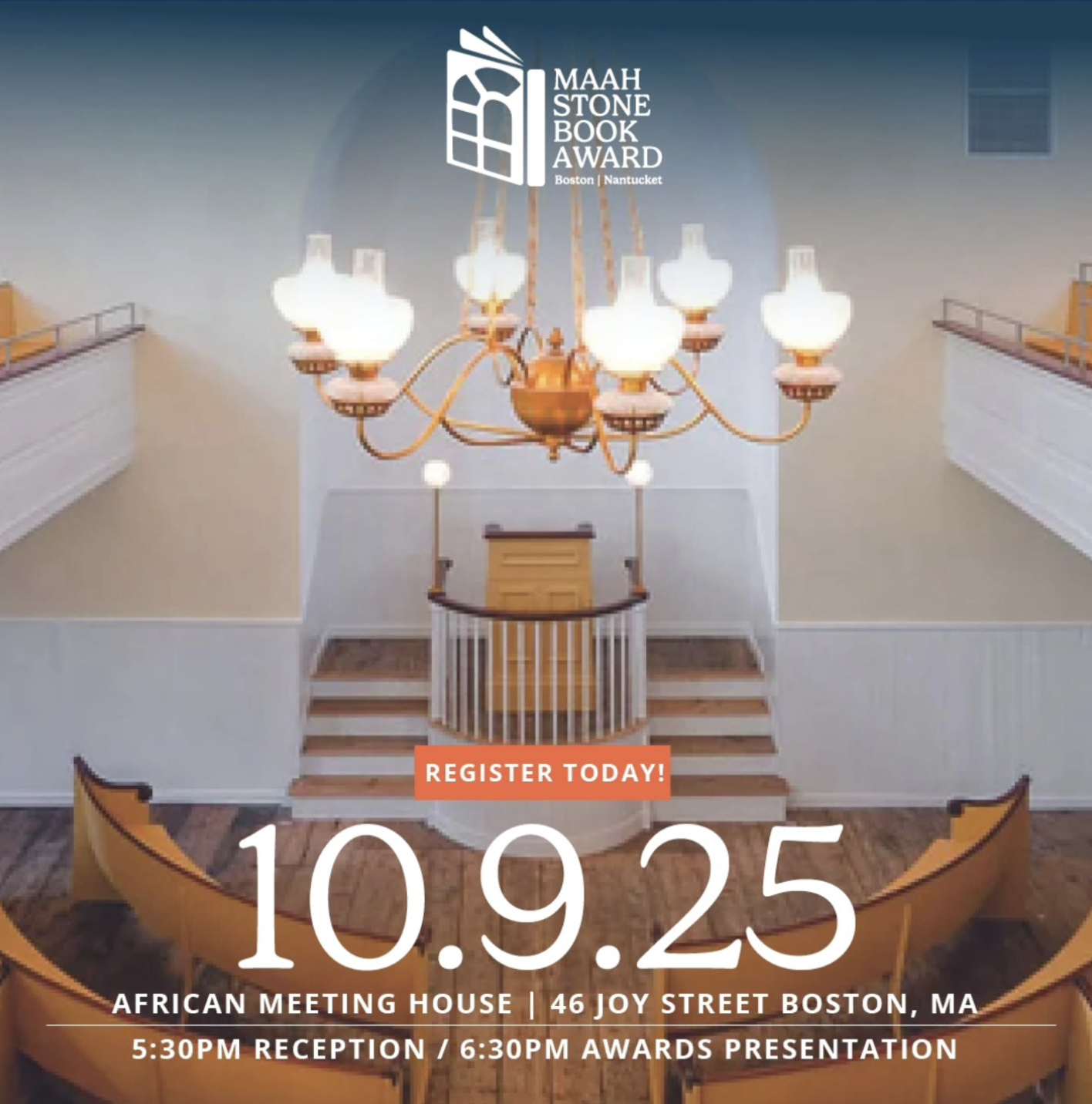 Experience an inspirational evening at the 2025 MAAH Stone Book Awards on October 9th, set in the heart of history at the African Meeting House. The celebration begins with a reception at 5:30pm and the awards presentation at 6:30pm. The first 100 guests to arrive will receive a signed copy of one of this year’s winning books!