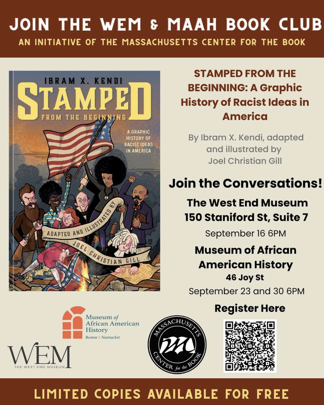In August & September, the West End Museum and the Museum of African American History are reading and discussing “Stamped from the Beginning” by Ibram X. Kendi.