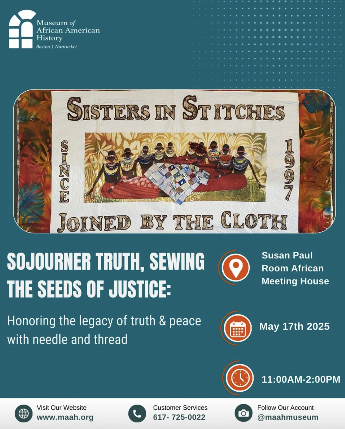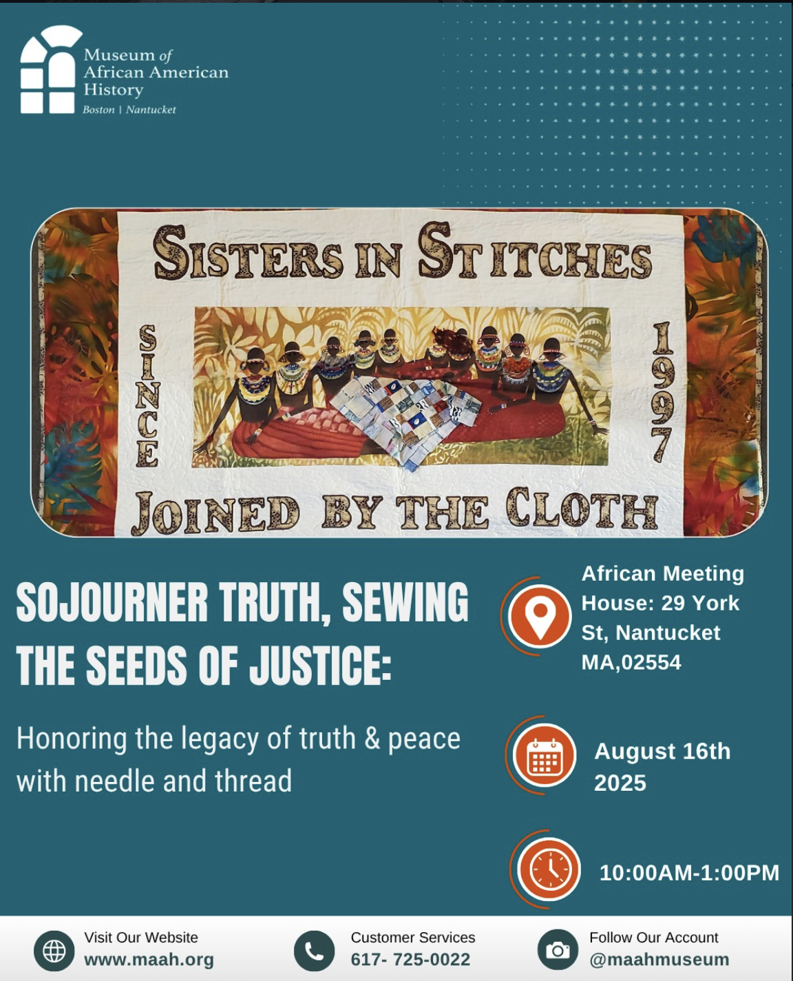 Join the Museum of African American History and Sisters in Stitches Joined By the Cloth for “Sojourner Truth, Sewing the Seeds of Justice: Honoring the Legacy of Truth and Peace with the Needle.” This “make your own block” quilt workshop and trunk show will include making two blocks, one to keep and one for the collaborative quilt created in honor of Sojourner Truth. This event will accept donations, though there is no cost for entrance. Support the preservation of our history with a suggested donation of $20 or simply by joining us and spreading the word!