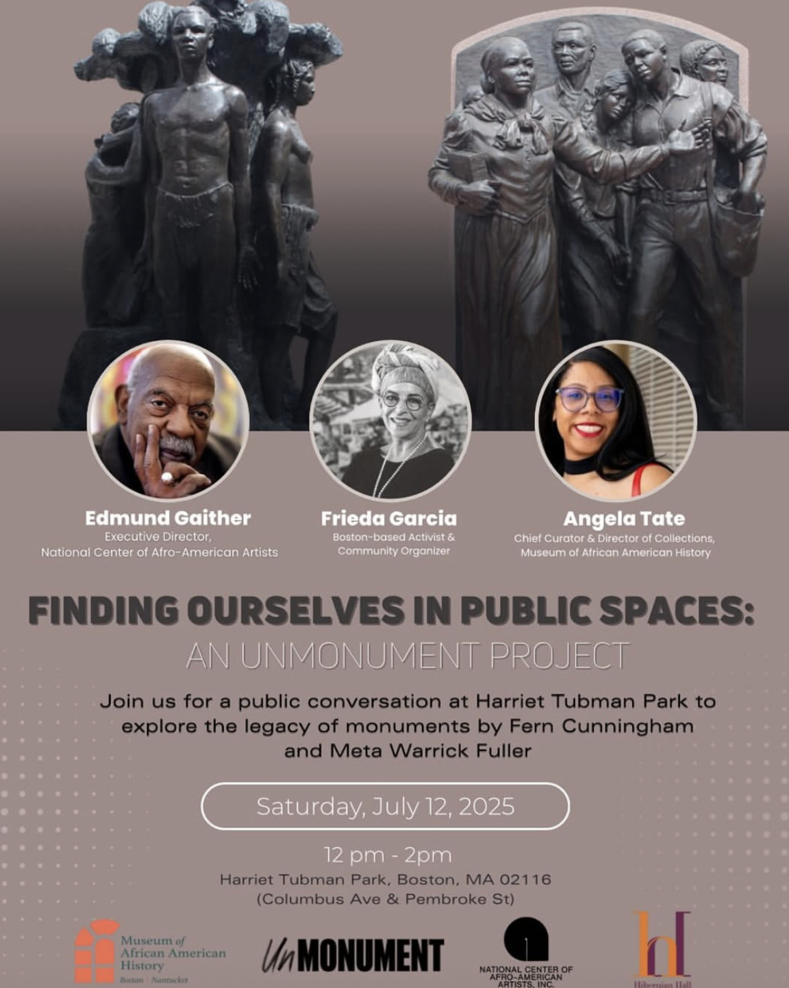FINDING OURSELVES IN PUBLIC SPACES: An UnMonument Project emphasizes the importance of highlighting Black women in our public spaces here in Boston. MAAH's Chief Curator & Director of Collections, Angela Tate, is joined by Boston-based activist Frieda Garcia & Dr. Edmund Gaither, founding Director of NCAA Boston for this important discussion.