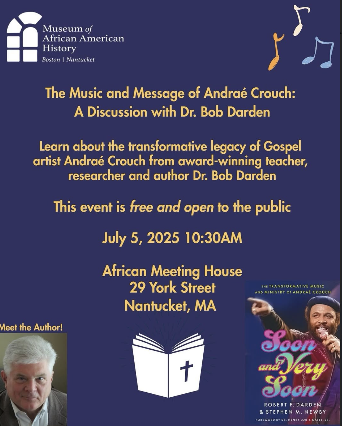 Learn about the transformative music and work of gospel artist Andraé Crouch through an insightful lecture by renowned teacher, researcher, and author Dr. Bob Darden. This engaging, free event is open to all and will be held in the African Meeting House at our Nantucket location on July 5, 2025, at 10:30 AM. Take part in this unique opportunity to learn about the profound influence of Crouch’s music and legacy.