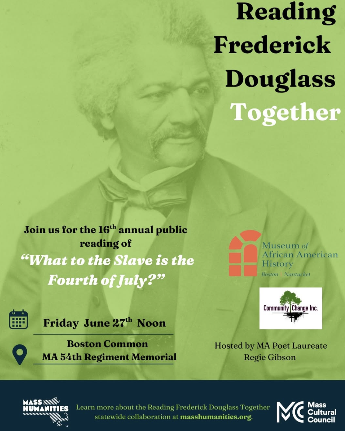 We're excited to be back at the MA 54th Regiment Memorial with @masshumanities, @masscultural, @cciantiracism, and @gibsonregie on Friday June 27th for the 16th annual public reading of "What to the Slave is the Fourth of July?" Join us at 12pm on the Boston Common. Participating in the reading is optional but encouraged.