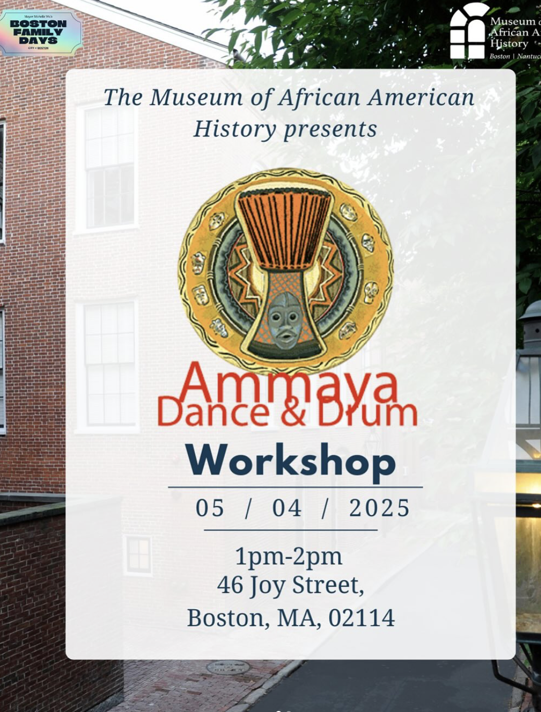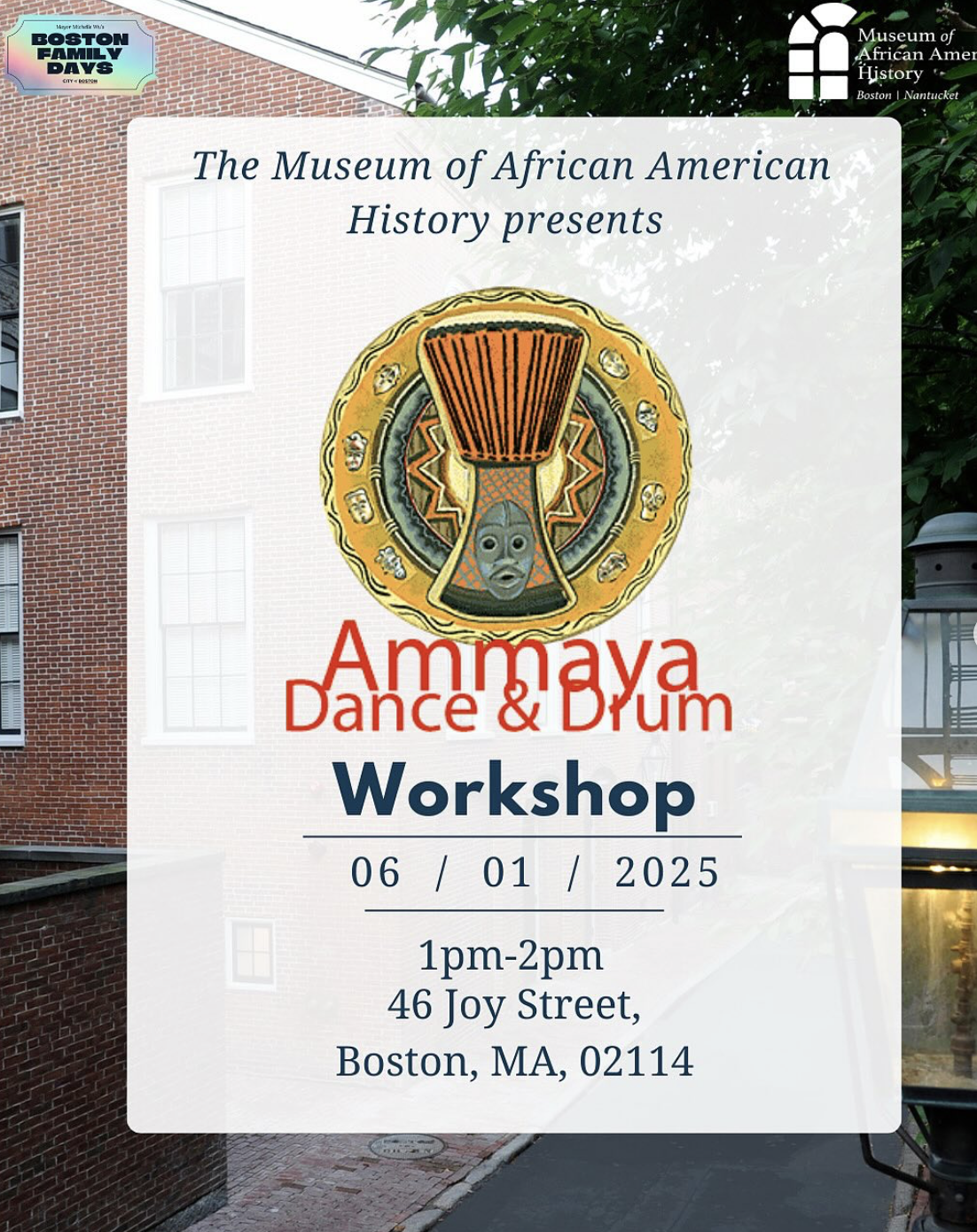 Join the Museum of African American History for our first Boston Family Day event in May. On Sunday, May 5th, from 1 to 2 p.m., we will hold a Drum Circle workshop with Ammaya Dance and Drum. Come prepared to participate and drum. They will also return to our Museum on the first Sunday in June.