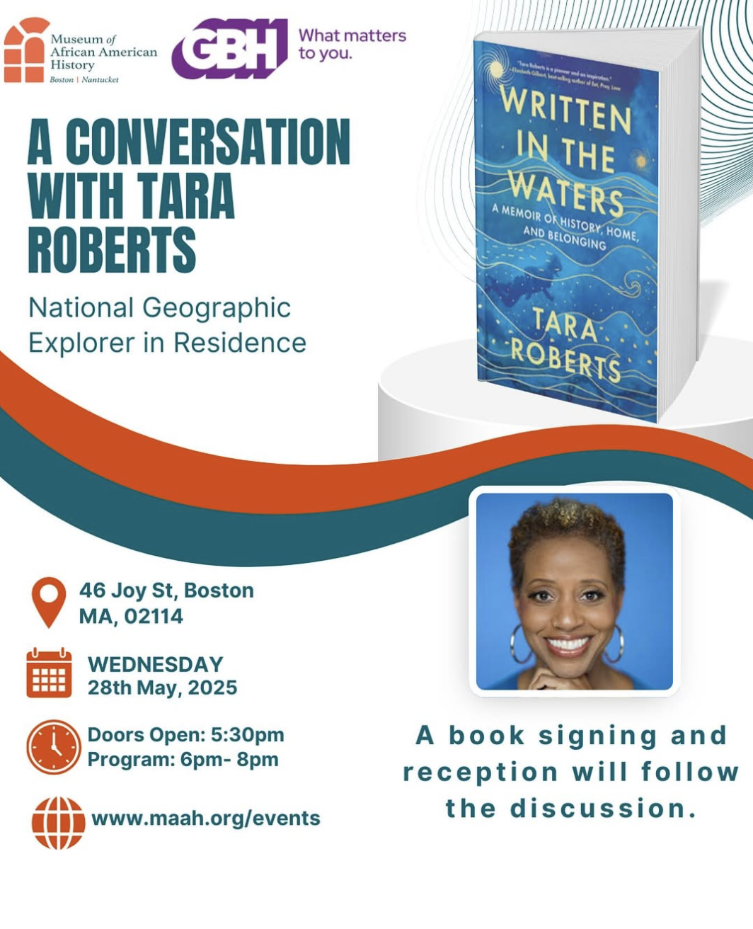 Join National Geographic Explorer in Residence Tara Roberts for an extraordinary evening as she shares the powerful journey behind her memoir, Written in the Waters: A Memoir of History, Home, and Belonging.