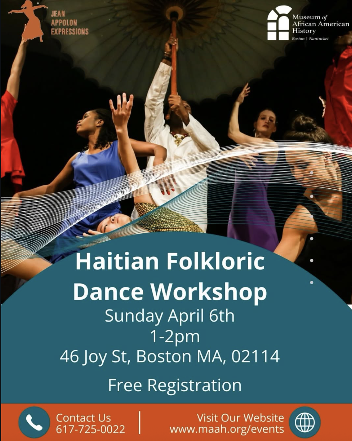 Join the Museum of African American History for a Workshop on Haitian Folkloric Dance as part of our Boston Family Day Programming. We invite everyone to join us as Jean Appolon Expressions leads a workshop for all levels. This workshop is grounded in building community and the belief that we can all dance and learn about ourselves and one another when we dance together.