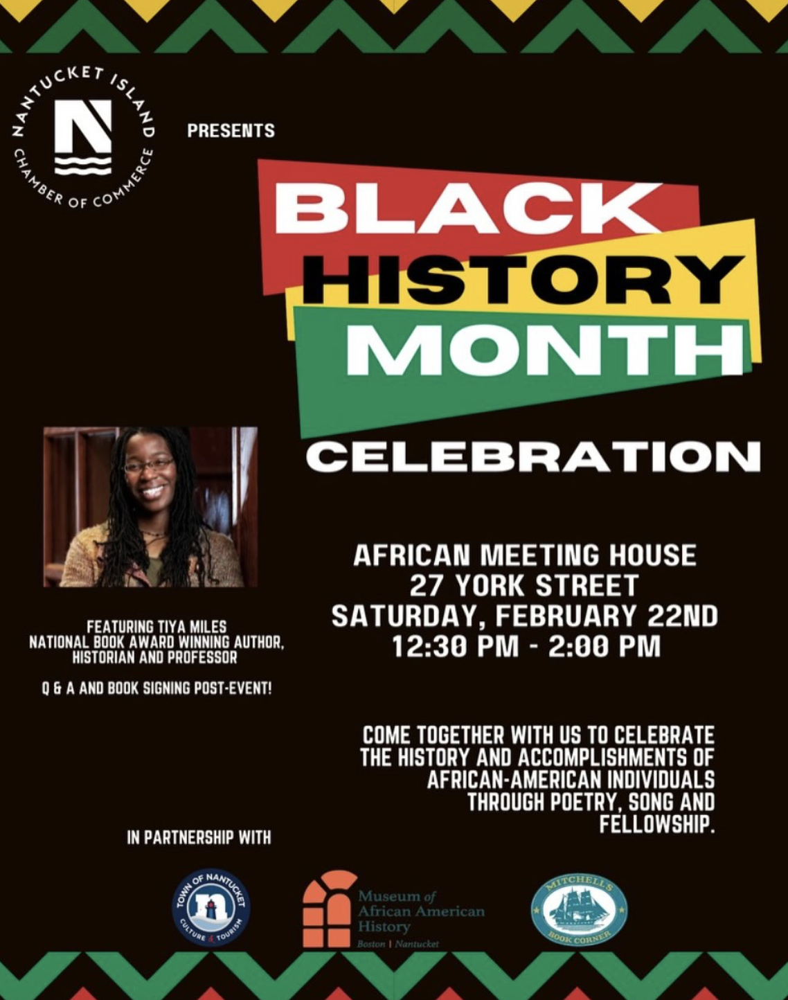 Join the Museum of African American History in partnership with the Nantucket Island Chamber of Commerce, Town of Nantucket Dept. of Culture & Tourism and Nantucket Book Partners. For a Black History Month Celebration.