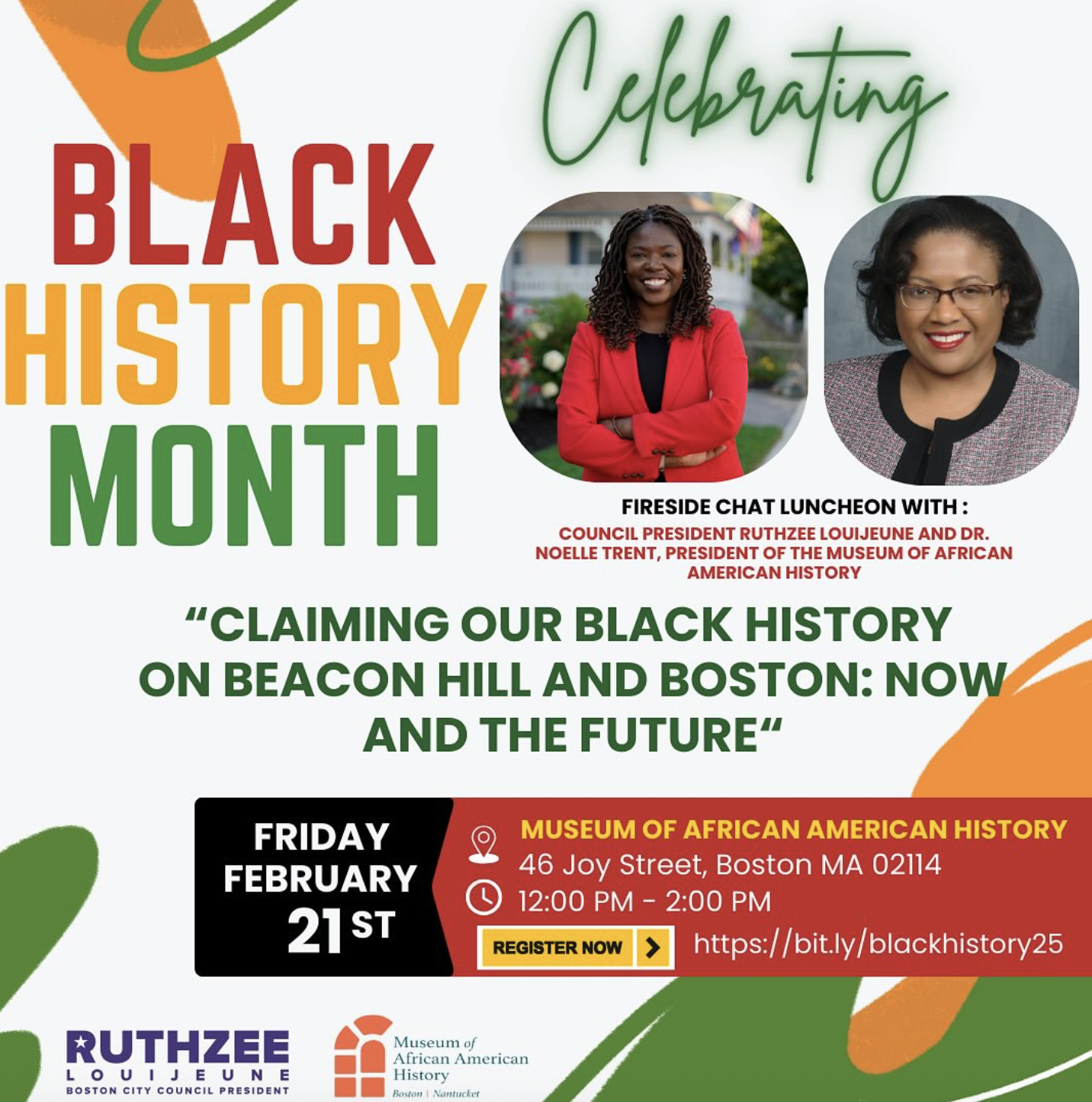 Join us at the Museum of African American History for a fireside chat between Boston Council President Ruthzee Louijeune and Dr. Noelle Trent, the museum’s president. The format will feature an intimate conversation followed by a lunch reception, creating space for meaningful community dialogue.This discussion will explore: