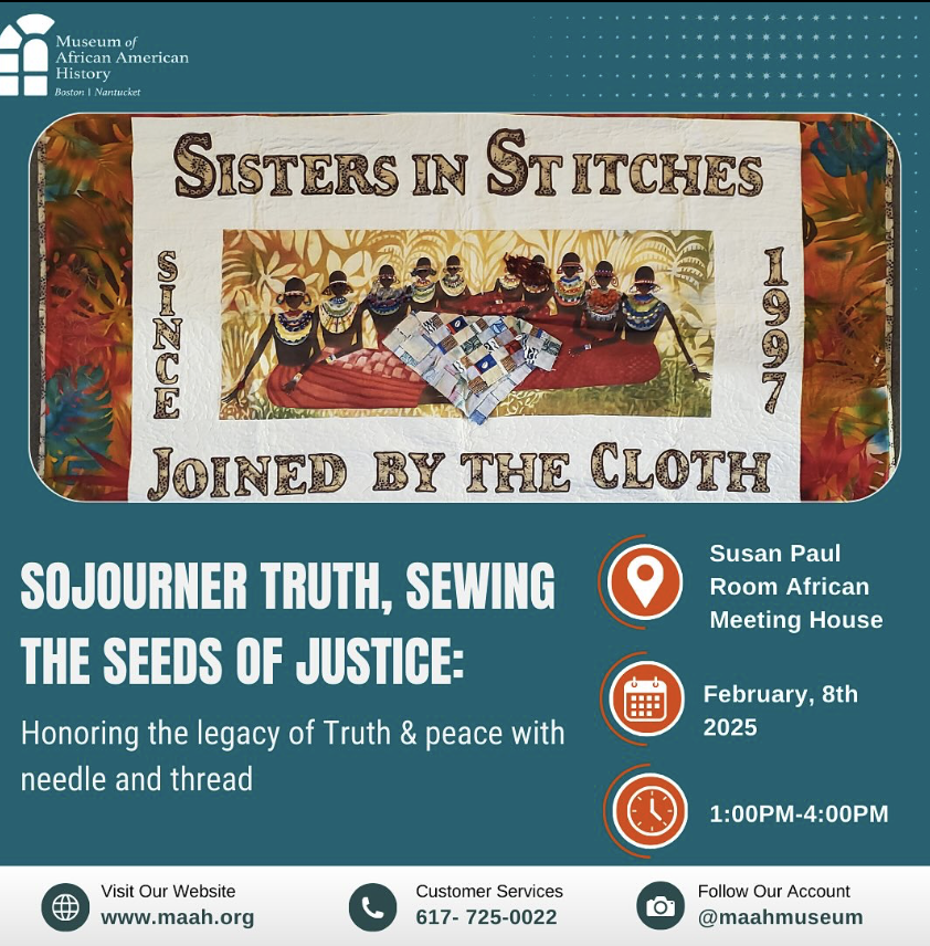 Join the Museum of African American History and SISJBTC, “Sojourner Truth, Sewing the Seeds of Justice: Honoring the Legacy of Truth and Peace with the Needle.” This “make your own block” quilt workshop and trunk show will include making two blocks, one to keep and one for the collaborative quilt created in honor of Sojourner Truth. This event is has a suggested donation of $20 to support the preservation of our history.