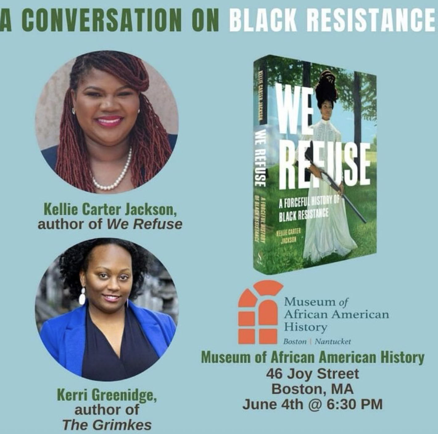 Join us for the We Refuse Book Release Party and Conversation! We are thrilled to invite you to Kellie Carter Jackson’s book release party and discussion with Dr. Kerri Greenidge. Come celebrate the launch of “We Refuse: A Forceful History of Black Reistance” at the historic African Meeting House. Free giveways to the first 50 guests who arrive. A book signing will be held at the conclusion of the event. Don’t miss out on this opportunity to connect with fellow book lovers and be part of this special event. Save the date! #WeRefuse