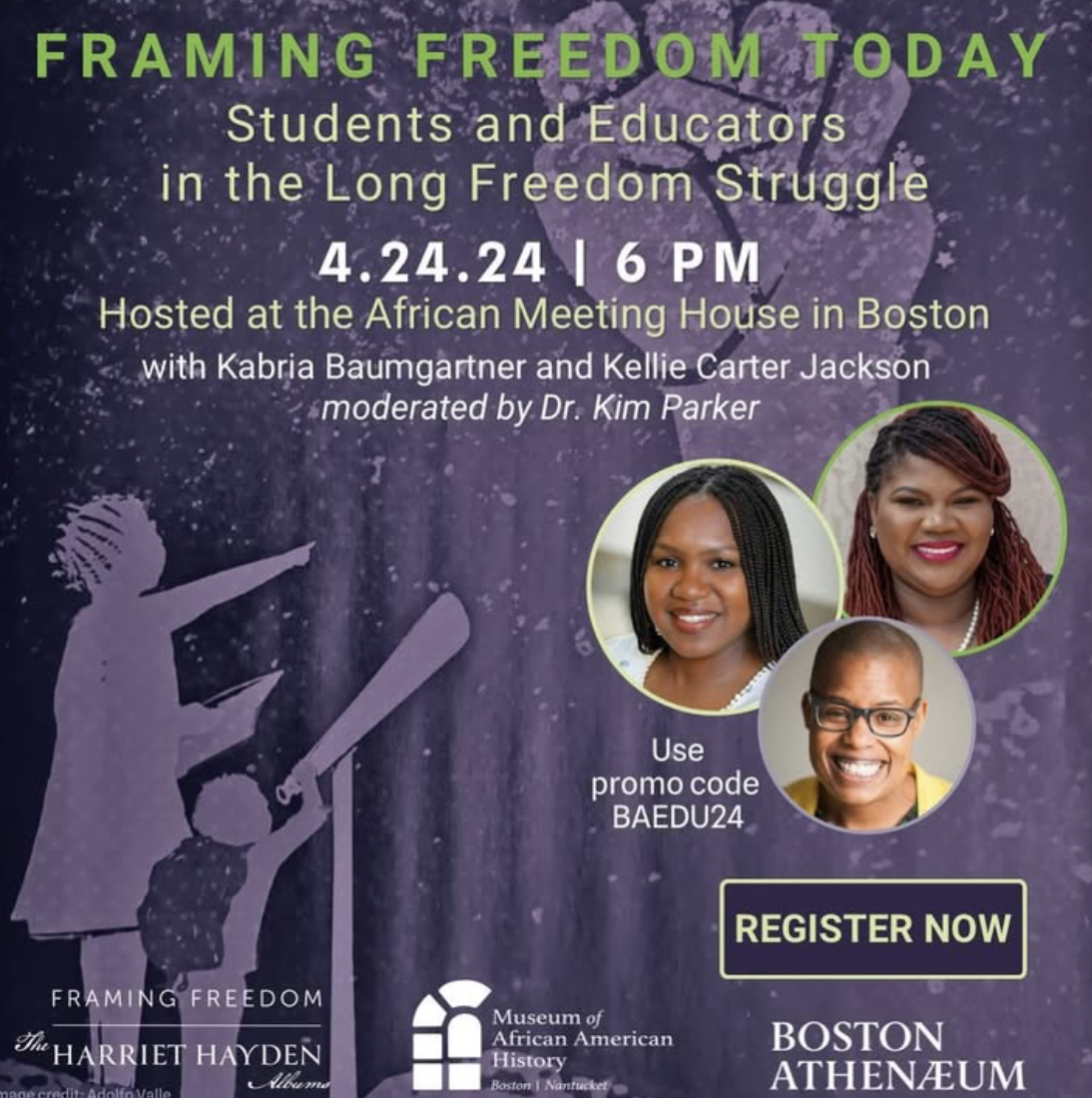 How can we empower youth to critically engage with the past, present, and future of social justice movements at a time when educators are being unfairly targeted? What can we learn from past educators, especially Black women, who built a tradition of educational activism? Moderated by Dr. Kim Parker, join educators and historians Kabria Baumgartner and Kellie Carter Jackson at the historic African Meeting House in Boston for a conversation about creating meaningful, inclusive, and transformative spaces for teaching and learning.