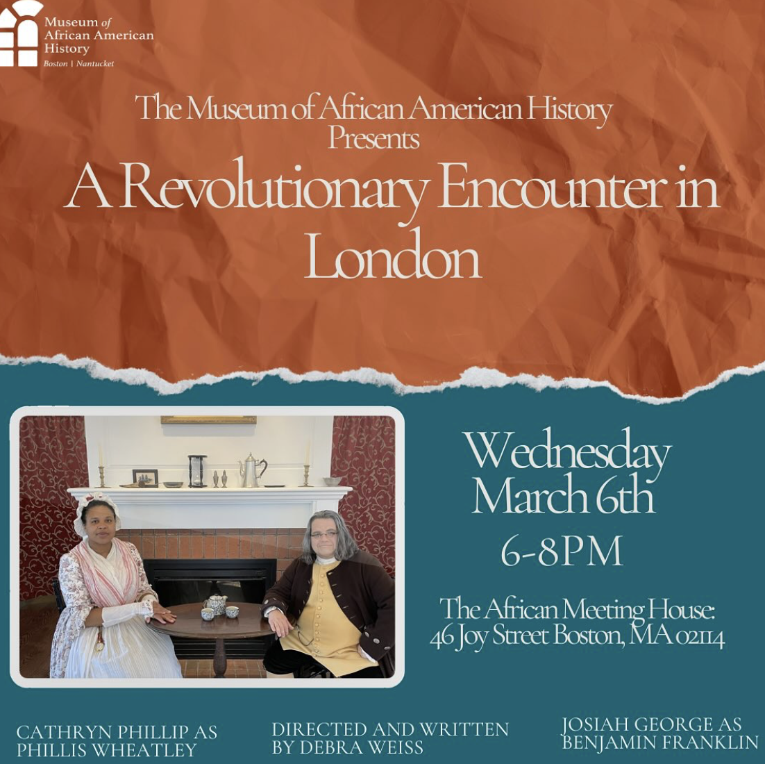 Join the Museum of African American History Wednesday, March 6, at 6pm for a presentation of A Revolutionary Encounter in London, an hour-long one-act play by Debbie Wiess about the little-known meeting between two of Boston’s most historic Colonial icons, Phillis Wheatley and Benjamin Franklin. On May 8th, 1773, enslaved African American poet Phillis Wheatley departed Boston for London to oversee the final preparations for publishing her book of poetry, Poems of Various Subjects, Religious and Moral. During her six-week stay in the British capital, she met many notables, including American Founding Father Benjamin Franklin, who had been living in London for over 15 years advocating for Colonial interests before the Crown and Parliament. The play is an imagining of their meeting unfolding in real-time, 251 years after their famous encounter. The play, featuring local actors Cathryn Philippe and Josiah George, will be presented as a staged reading in the sanctuary of the African Meeting House on Smith Court off of Joy Street in Beacon Hill, Boston. It will be followed by a discussion and then reception of light refreshments. The event is free and open to all, but rsvps are requested.
