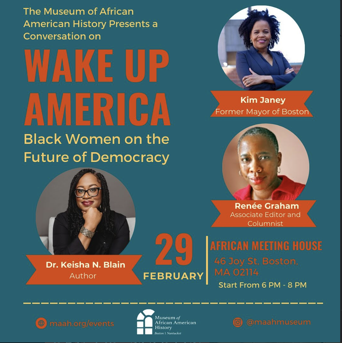 Join the Museum of African American History for a special presentation on Wake Up America: Black Women on the Future of Democracy, a new anthology that brings together the voices of major progressive Black women politicians, grassroots activists, and intellectuals who offer insights on how we can create a more equitable political future. Learn more about this project through a panel discussion featuring the book’s editor, Dr. Keisha N. Blain, who will be joined by contributors Kim Janey and Renee Graham. Zenzile Riddick from Harvard’s Graduate School of Education will moderate the conversation. Be sure to stay until the end to meet the panelists for a book signing at the end of the event.