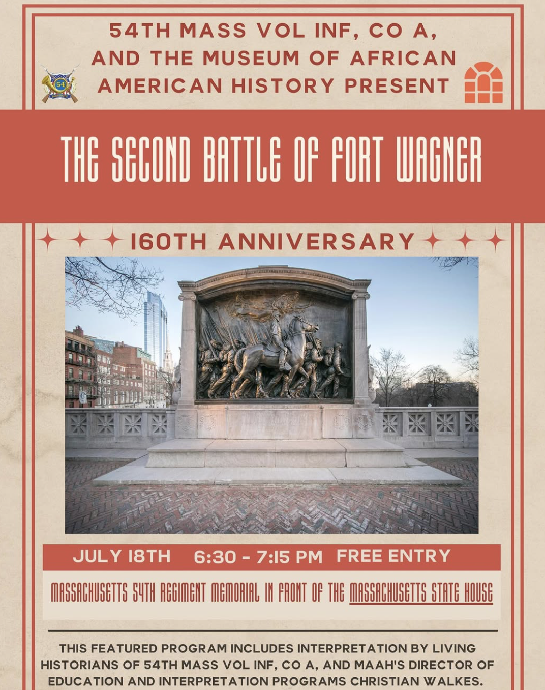Join us tomorrow at the Robert Gould Shaw and 54th Regiment Memorial for a special program commemorating the 160th Anniversary of the Battle for Fort Wagner. Come learn their story and celebrate their heroism through historical reenactment.