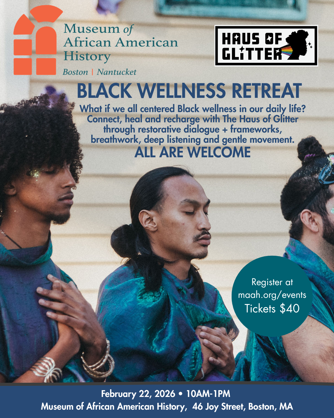 What if we all centered Black wellness in our daily life? Connect, heal and recharge with The Haus of Glitter at the Museum of African American History. Through restorative dialogue + frameworks, breathwork, deep listening and gentle movement, this retreat invites adults 18 and up to nurture yourself and build community.