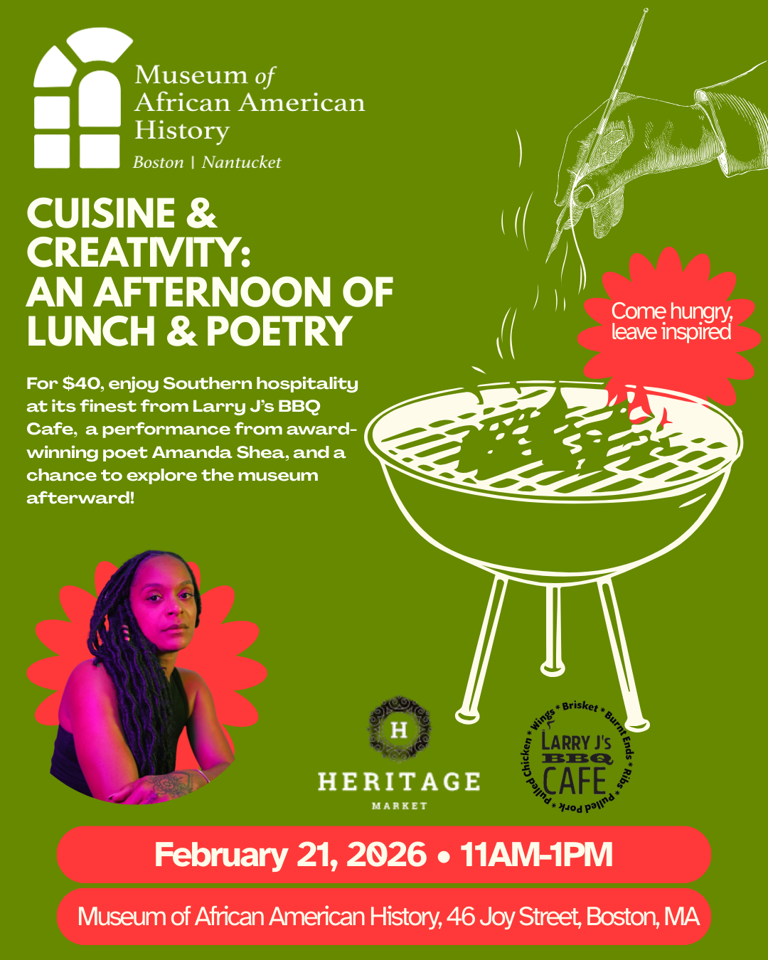 Enjoy Southern hospitality at its best. Savor a flavorful meal created in collaboration with Heritage Market and award-winning chef Larry J of Larry J’s BBQ Café followed by a performance featuring Boston poet Amanda Shea.