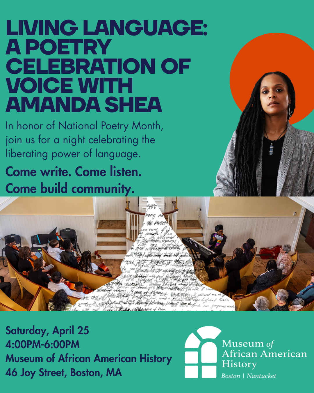 In honor of National Poetry Month, Living Language is an evening of poetry, reflection, and community celebrating the liberating power of language. Special guest poet Amanda Shea will join the lineup, bringing her dynamic storytelling and perspective to the stage. The evening also includes a limited community open mic for local poets and an interactive mini-workshop, Poetry as Preservation, where participants will write a five-line poem inspired by a museum artifact or exhibit piece. The program closes with a collective reading of audience-created poems and an invitation to continue building community through future MAAH events.