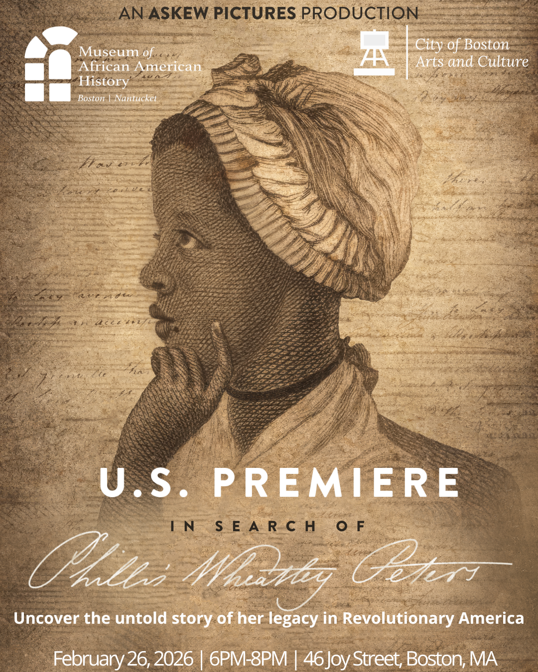 Experience the United States premiere of In Search of Phillis Wheatley Peters. Directed by Leslie Askew of Askew Pictures, this compelling film explores the remarkable life, legacy, and impact of Phillis Wheatley Peters. Through powerful storytelling and historical insight, the film sheds light on her contributions and the enduring significance of her work. Join us for an evening of history, reflection, and inspiration, and witness this important story to come to life.