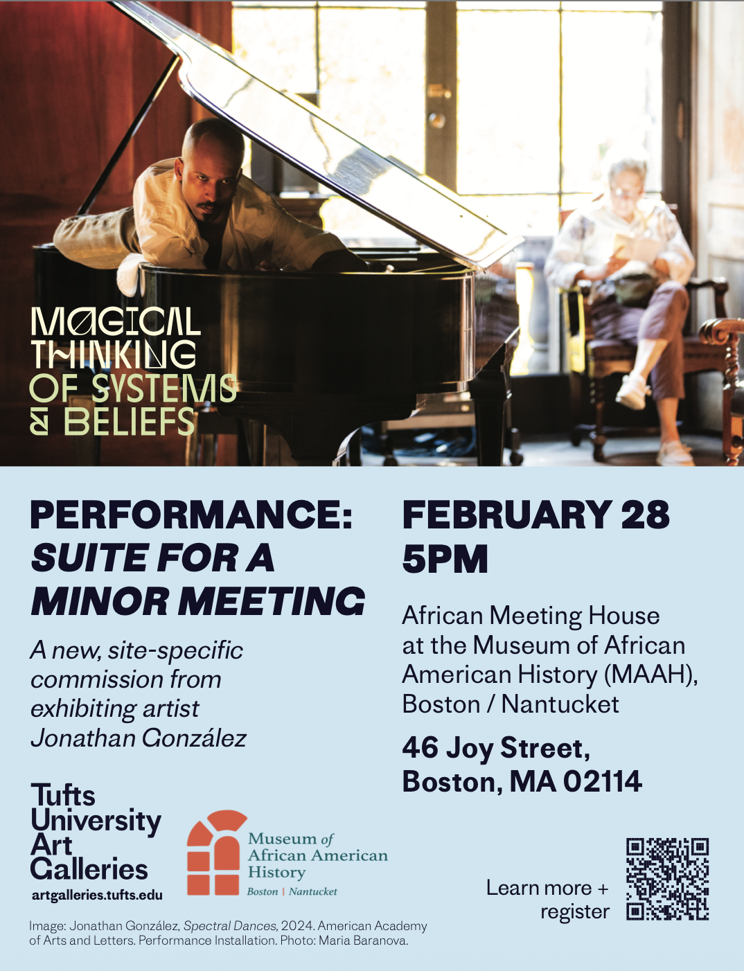 Experience "suite for a minor meeting" at the historic African Meeting House in Boston. This free live presentation by Jonathan González unfolds through movement, sound, sculpture, and text, activating one of the city’s most historic spaces.Space is limited and registration is encouraged. Reserve your place and witness an immersive artistic encounter. Be part of this powerful cultural moment in a landmark setting today.