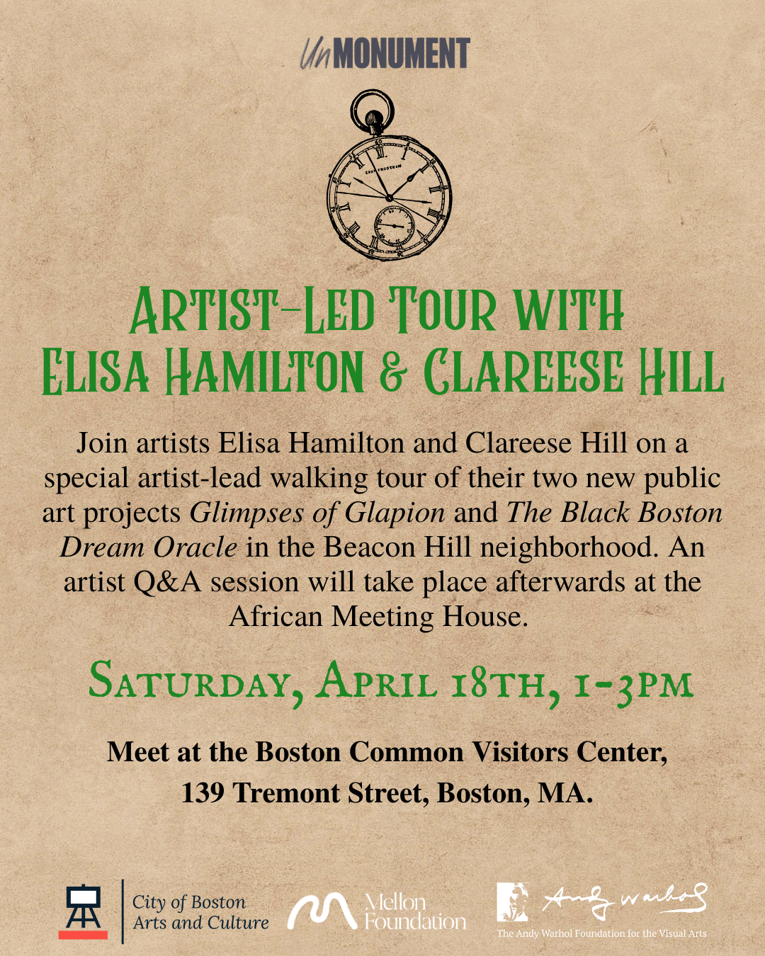 Experience Beacon Hill through art and history with artists Elisa Hamilton and Clareese Hill on a special walking tour of their public art projects, Glimpses of Glapion and The Black Boston Dream Oracle. The tour begins at 1:00 pm at the Boston Common Visitors Center and invites participants to explore digital and XR works that bring Boston’s Black history and stories to life through immersive storytelling and reflection. The experience continues with a reception and Q&A at 2:15 pm at the Museum of African American History, offering a chance to engage directly with the artists and learn more about their creative process.