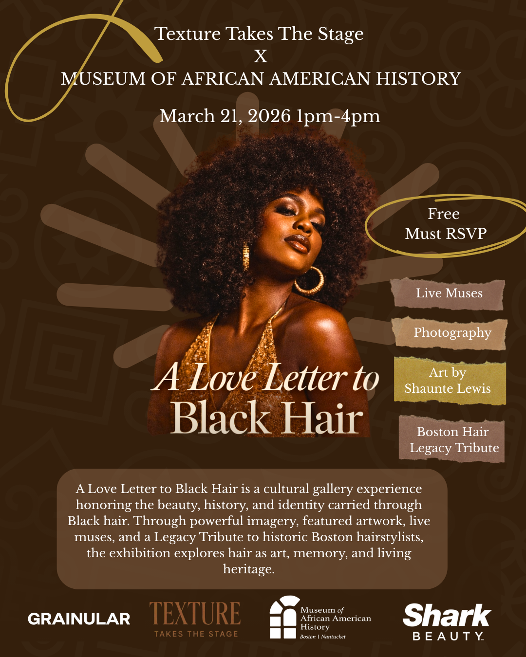 Step into an immersive cultural experience celebrating the power, artistry, and legacy of Black hair. Through live muses, curated visual art, striking photography, and a special Boston Hair Legacy Tribute, this gallery honors the stories, memories, and identity carried in every strand. This is more than an exhibition, it’s living heritage. Celebrate the culture. Uplift the beauty. Preserve the legacy.